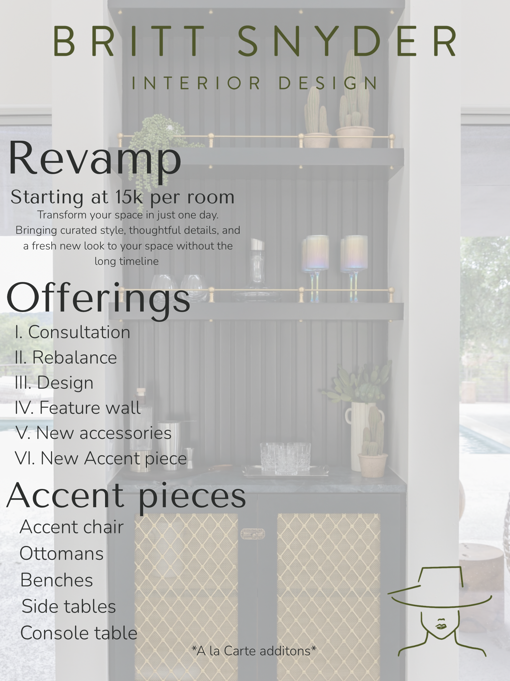 The Revamp is a one-day design experience that introduces fresh perspective, updated styling, and thoughtfully curated pieces—transforming the look and feel of your space without a full redesign. We rework what’s there, introduce key new elements, and create a space that feels current, cohesive, and elevated. Starting at $15,000 per room